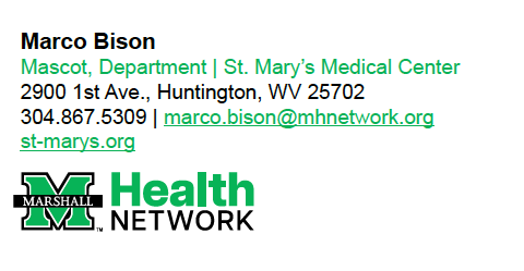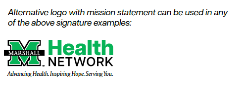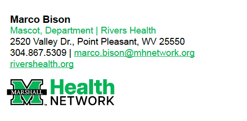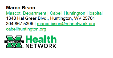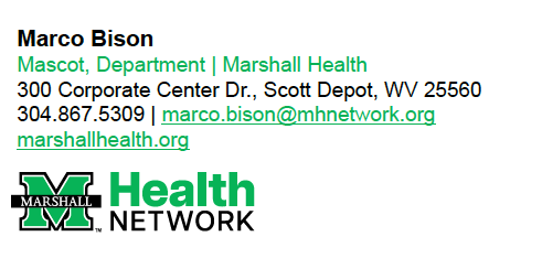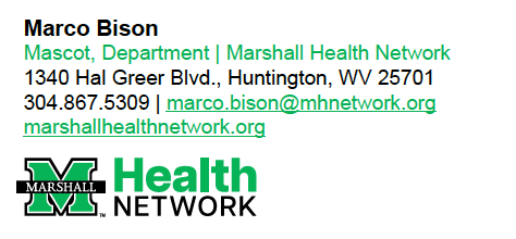 Use the email signature template below to professionally showcase your affiliation with Marshall Health Network, the Marshall University Joan C. Edwards School of Medicine and/or our member organizations.