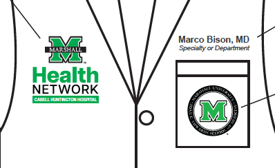 Faculty and staff may choose to use the Marshall Health Network and/or the School of Medicine logos for embroidery on white coats. The School of Medicine logo, represented by a 3.5” patch, should always be placed on the left breast pocket of the white coat. The Marshall Health Network logo and its affiliates should always be represented on the right breast of the white coat. Standard information listed above the pocket often includes the name, department, division or title, as shown below.